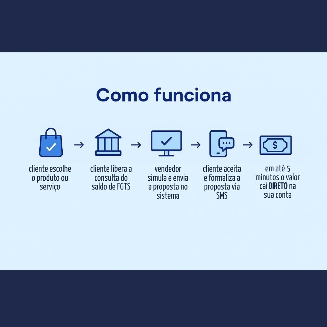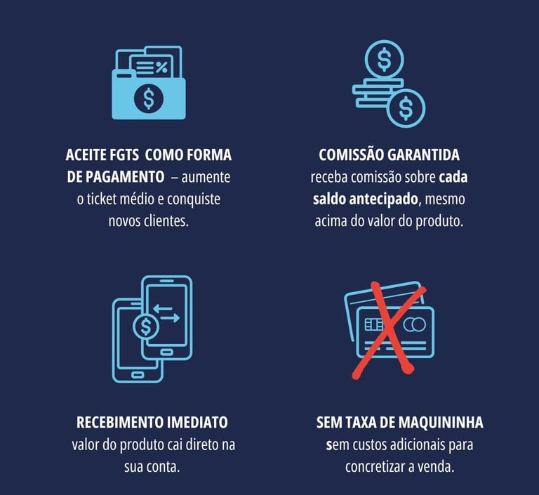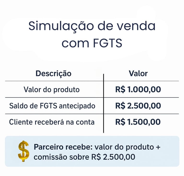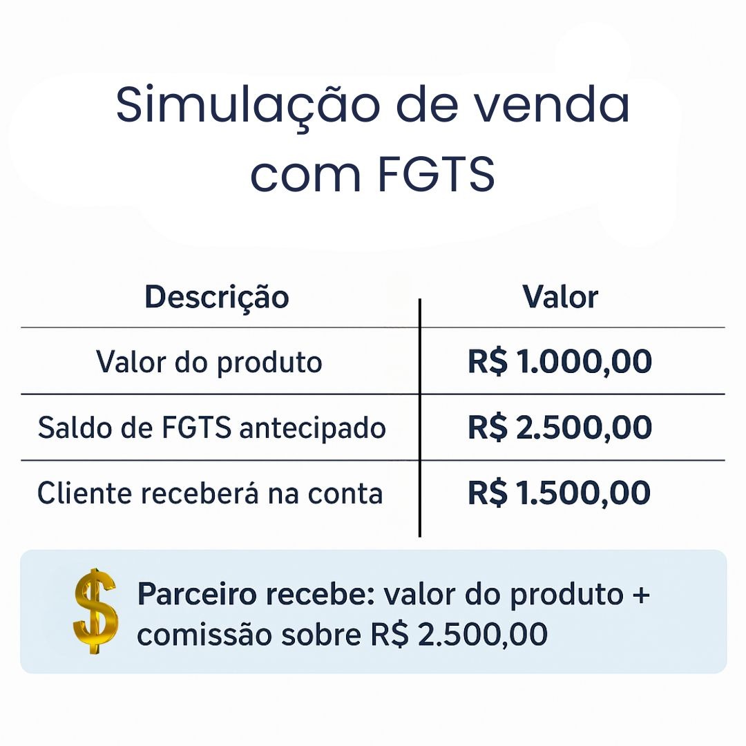 Uma plataforma onde você simula e contrata a operação de pagamento via FGTS para seu cliente, recebe o valor do produto diretamente na sua conta – sem taxas ou custos adicionais, ganha comissão sobre cada venda e ainda conta com suporte online e treinamento exclusivo para toda sua equipe.