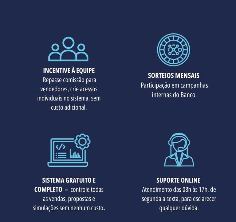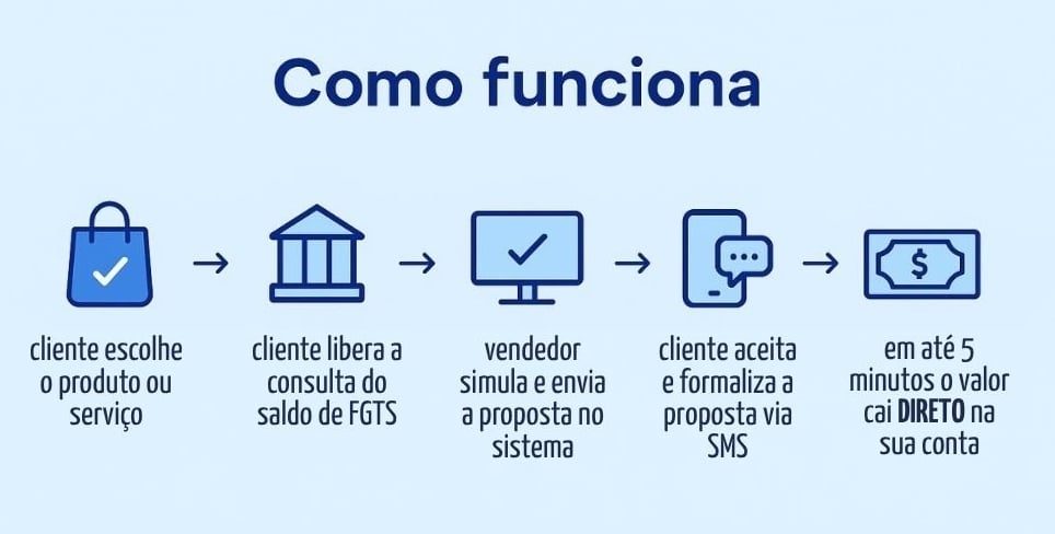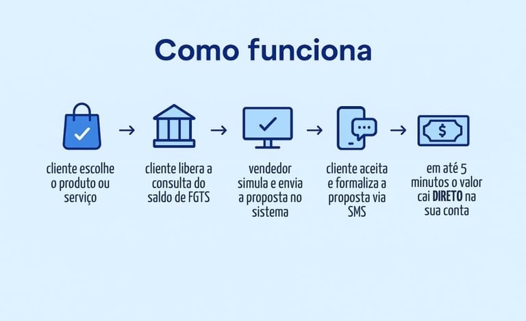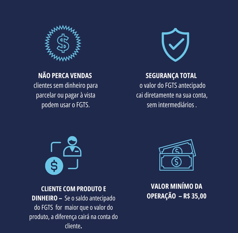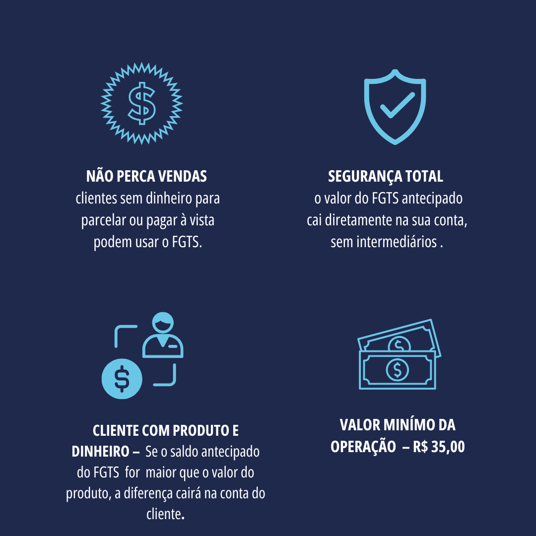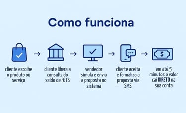 Uma plataforma onde você simula e contrata a operação de pagamento via FGTS para seu cliente, recebe o valor do produto diretamente na sua conta – sem taxas ou custos adicionais, ganha comissão sobre cada venda e ainda conta com suporte online e treinamento exclusivo para toda sua equipe.